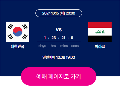 . 2024년 10월 15일, 용인 미르 스타디움에서 열리는 월드컵 아시아 3차 예선 한국 vs 이라크 경기 예매는 아래에서 할 수 있습니다.