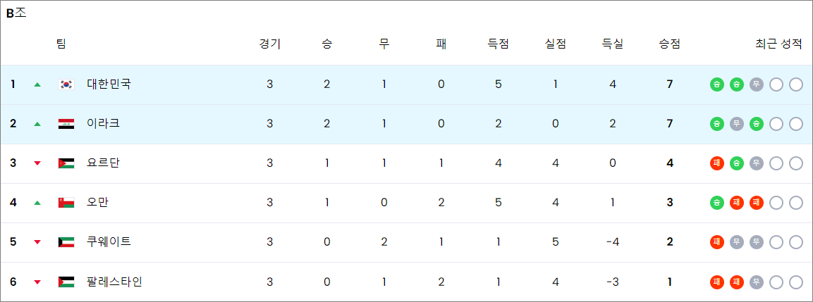 아래는 2026 FIFA 월드컵 아시아 지역 예선 3차 예선에서 대한민국 축구 대표팀이 참여한 경기 일정과 순위 현황입니다: